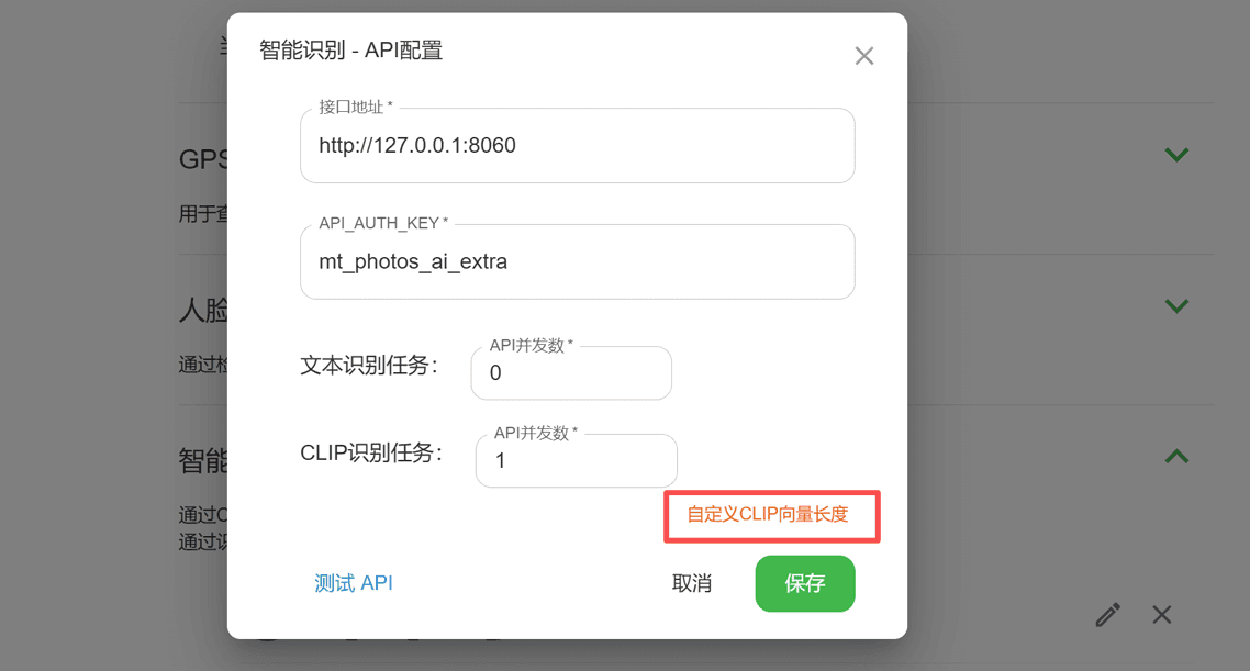 默认CLIP模型返回的向量长度为512,比如使用的模型返回的向量长度不是512,需要在 智能识别API配置那边通过 自定义CLIP向量长度 来修改;