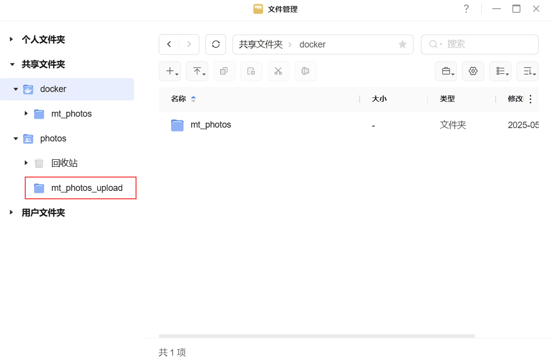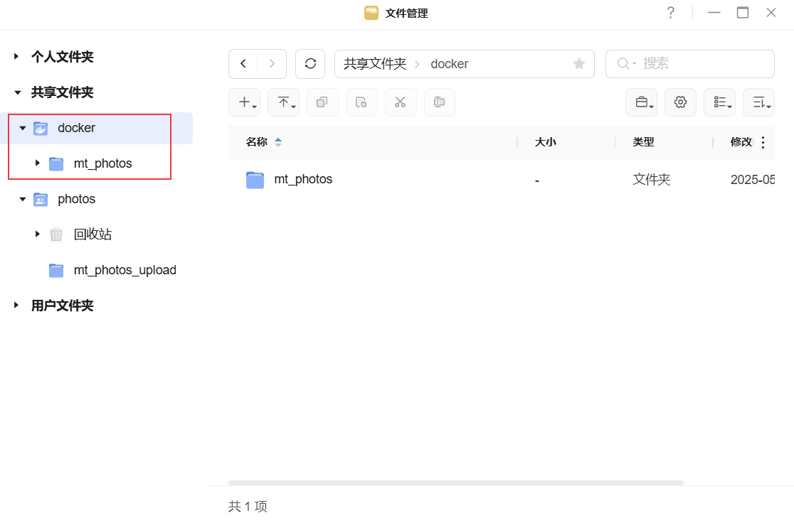 打开【文件管理】,在 共享文件夹/docker 下创建 mt_photos文件夹 ;