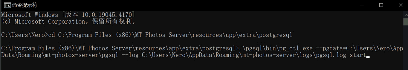 D:再回车来切换到D盘Microsoft Windows [版本 10.0.19045.4170] (c) Microsoft Corporation。保留所有权利。 C:\Users\Nero>D: D:\>cd D:\Program Files (x86)\MT Photos Server\resources\app\extra\postgresql