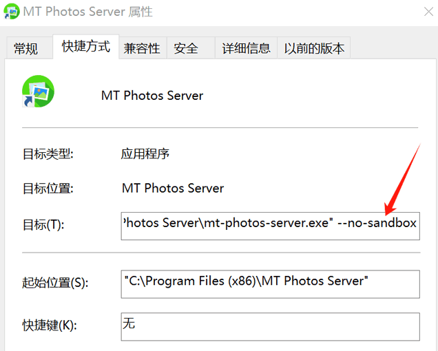 在桌面,右键MT Photos的快捷方式,然后打开属性,在目标的结尾增加 --no-sandbox