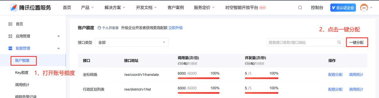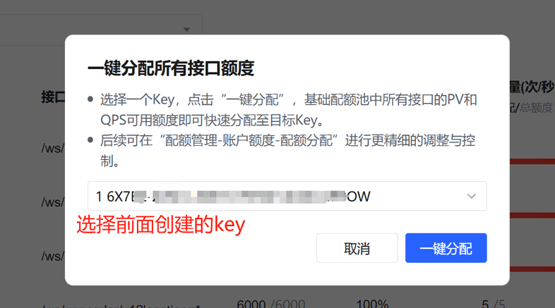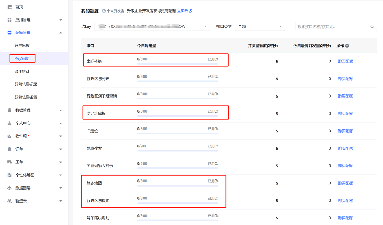 或者返回 账号额度 ,点击 单个接口右侧的 配额分配,查看key的分配额度;